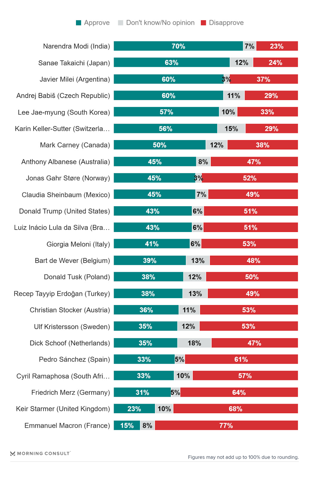 The polling for world leaders looks bleak. A Morning Consult poll finds that only seven major world leaders have net approval ratings, and only two of those seven have been in office for more than a year.